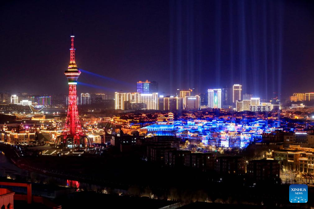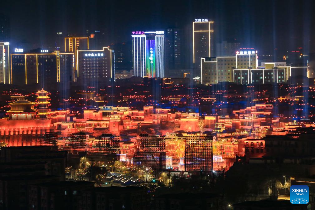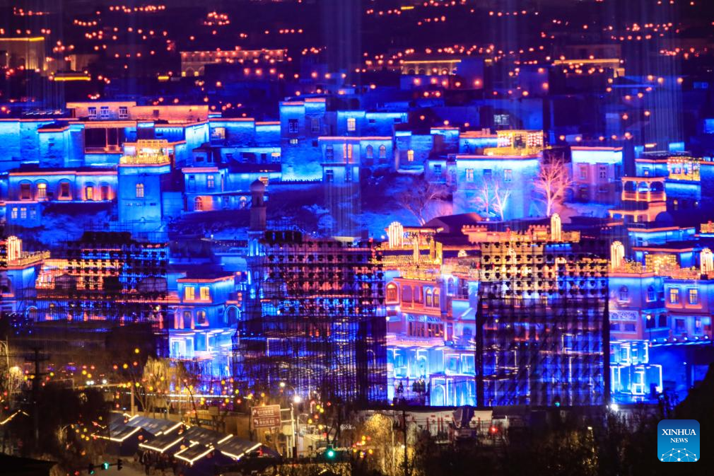 This photo taken on Feb. 9, 2024 shows a night view in Kashgar, northwest China's Xinjiang Uygur Autonomous Region. Kashgar has been meticulously decorated to celebrate the Spring Festival. The ancient city of Kashgar is a branch venue of this year's China Central Television (CCTV) Spring Festival Gala. (Photo by Cai Zengle/Xinhua)