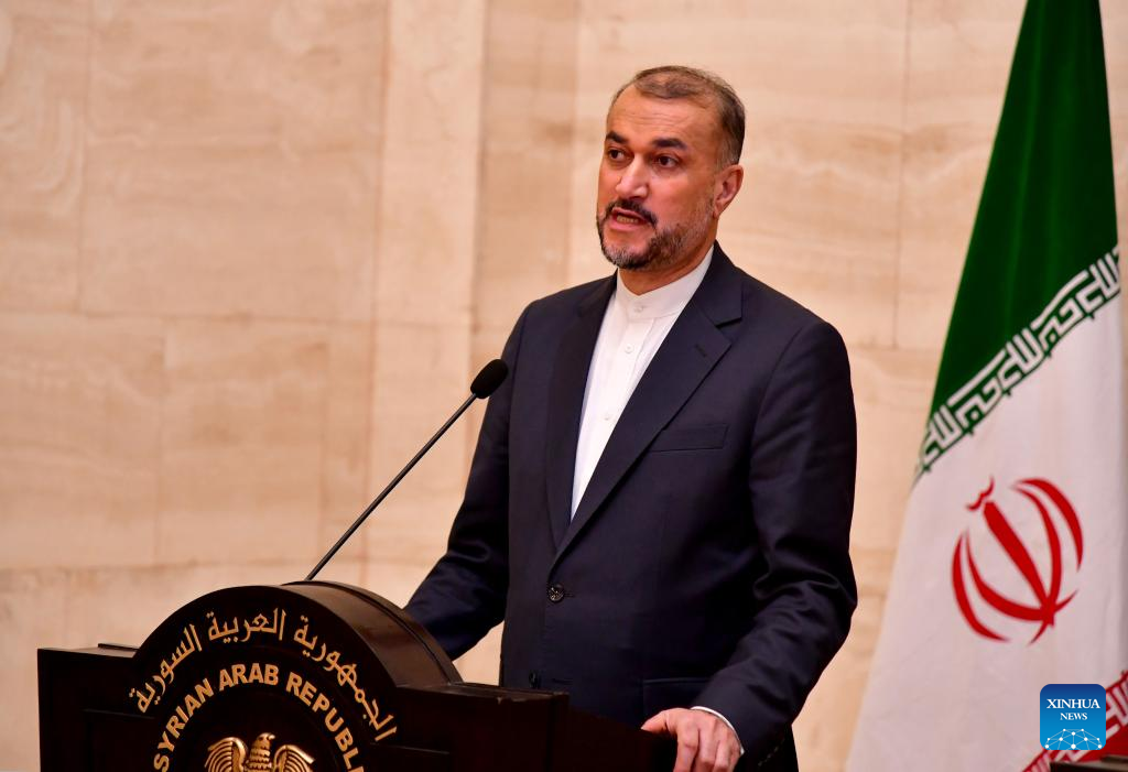 Iranian Foreign Minister Hossein Amir-Abdollahian speaks at a joint press conference with his Syrian counterpart Faisal Mekdad in Damascus, Syria on Feb. 11, 2024. Syrian Foreign Minister Faisal Mekdad reiterated on Sunday that Syria's top priority is to defy the presence of any unauthorized foreign forces on its territory. (Photo by Ammar Safarjalani/Xinhua)