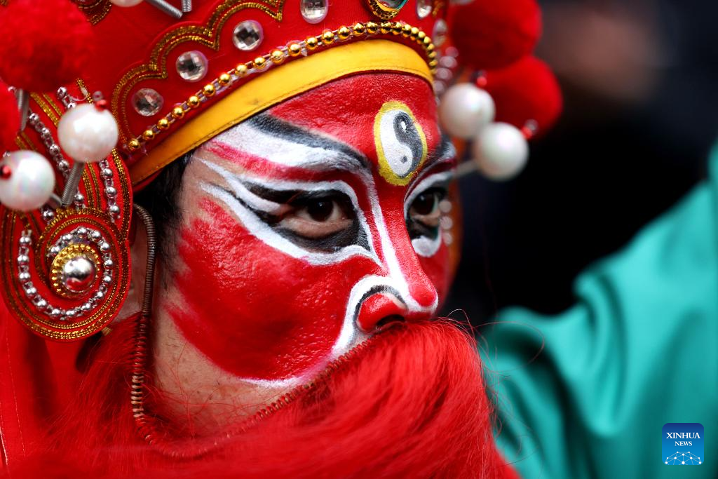 An artist performs Yingge Dance, a form of folk dance popular in south China's Guangdong Province, at Burlington Arcade in London, Britain, Feb. 10, 2024. (Xinhua/Li Ying)