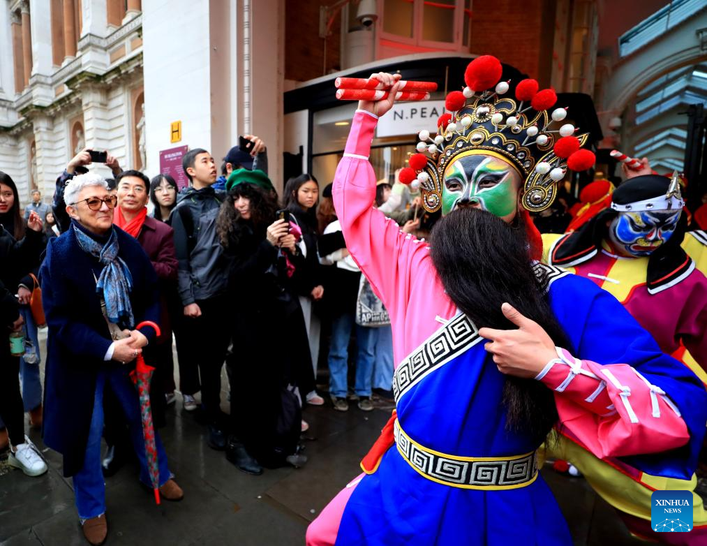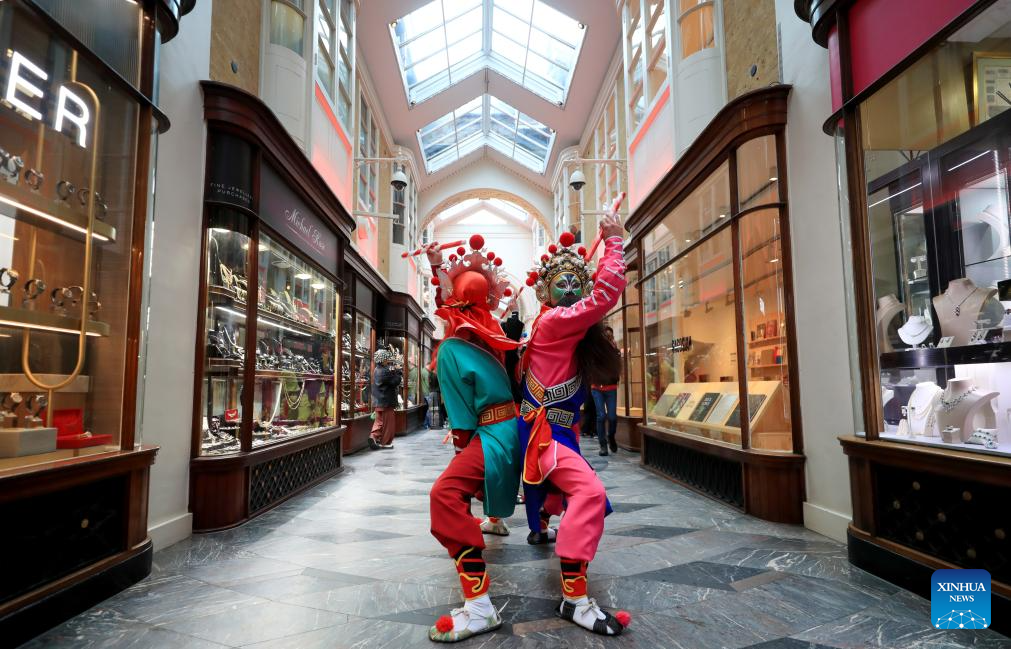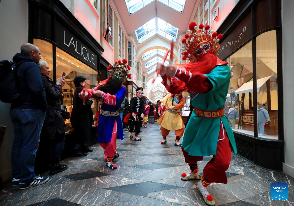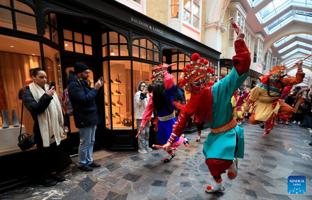 Artists perform Yingge Dance, a form of folk dance popular in south China's Guangdong Province, at Burlington Arcade in London, Britain, Feb. 10, 2024. (Xinhua/Li Ying)