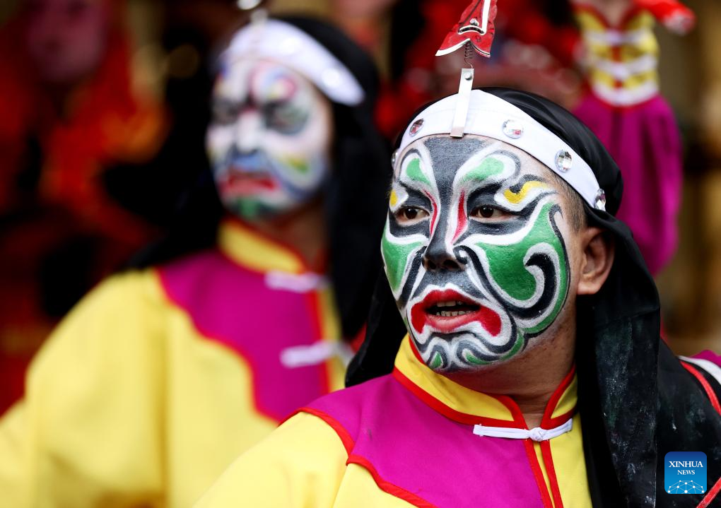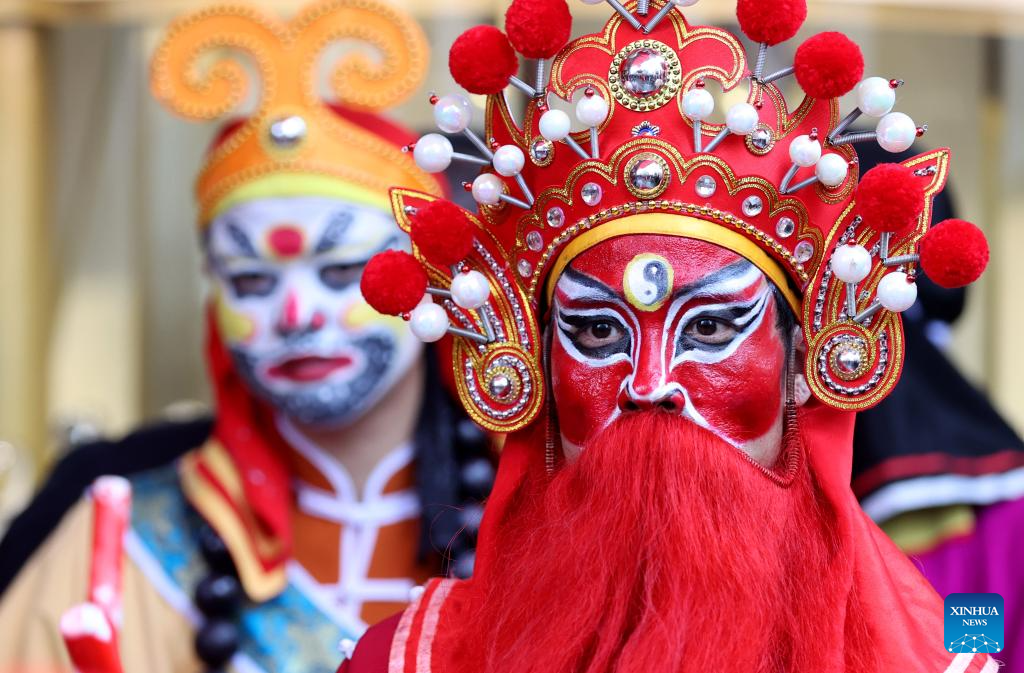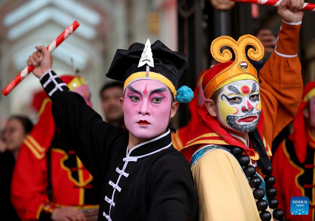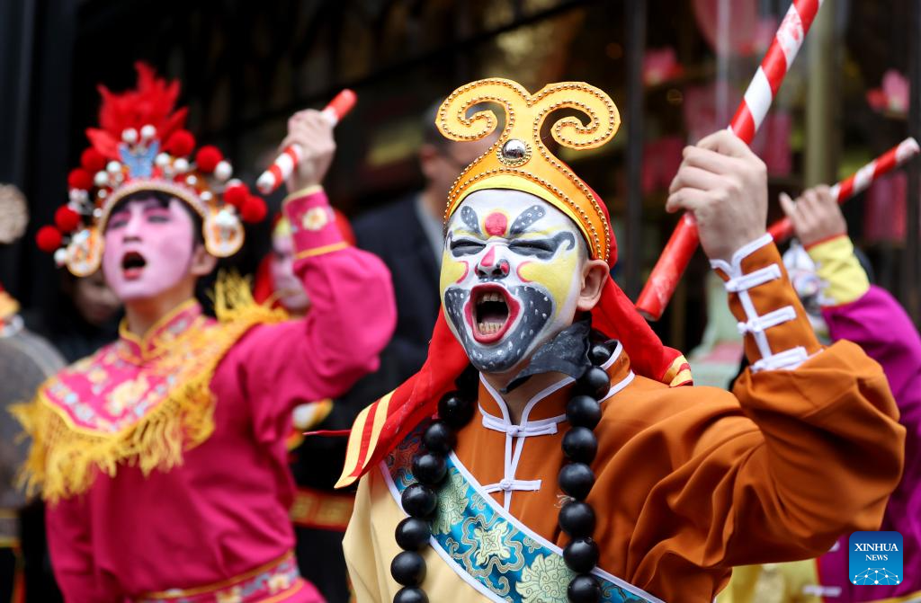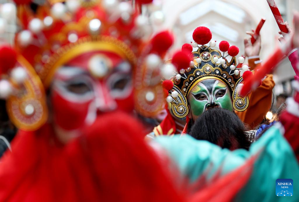Artists perform Yingge Dance, a form of folk dance popular in south China's Guangdong Province, at Burlington Arcade in London, Britain, Feb. 10, 2024. (Xinhua/Li Ying)