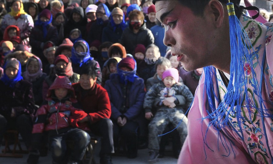 A folk artist gives an opera performance in Zouping County, east China's Shandong Province after the Lantern Festival of 2012.