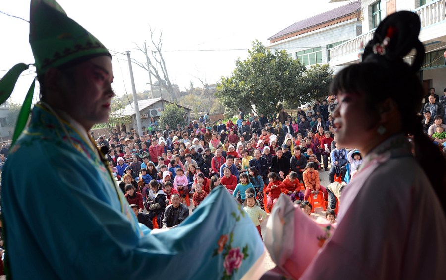 People watch an opera performance in Nanchang City, east China's Jiangxi Province, ahead of the Spring Festival of 2013.