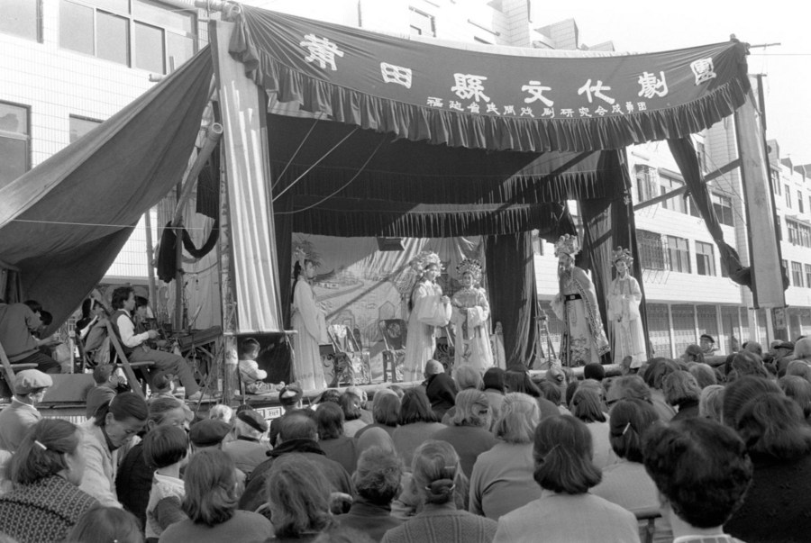 Actors give an opera performance during a tour to villages in Putian City, southeast China's Fujian Province during the Spring Festival of 1995.