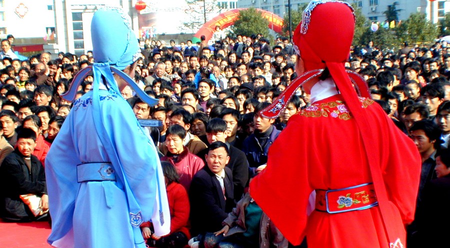 People watch an opera performance at a park in Wenling City, east China's Zhejiang Province during the Spring Festival of 2003.
