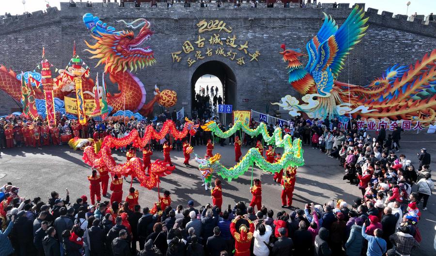 Tourists watch a dragon dance performance at the Zhengding ancient city in Shijiazhuang, north China's Hebei Province, Feb. 15, 2024. (Photo by Chen Qibao/Xinhua)
