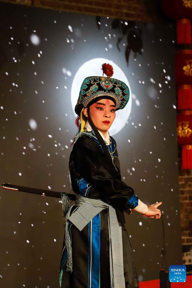 An artist performs Peking opera during a celebration of Chinese Spring Festival at the Irish Emigration Museum in Dublin, Ireland, on Feb. 15, 2024. On Thursday, a performance staged at the Irish Emigration Museum in Dublin, featuring Peking opera, martial arts, as well as traditional music and dance. (Xinhua)