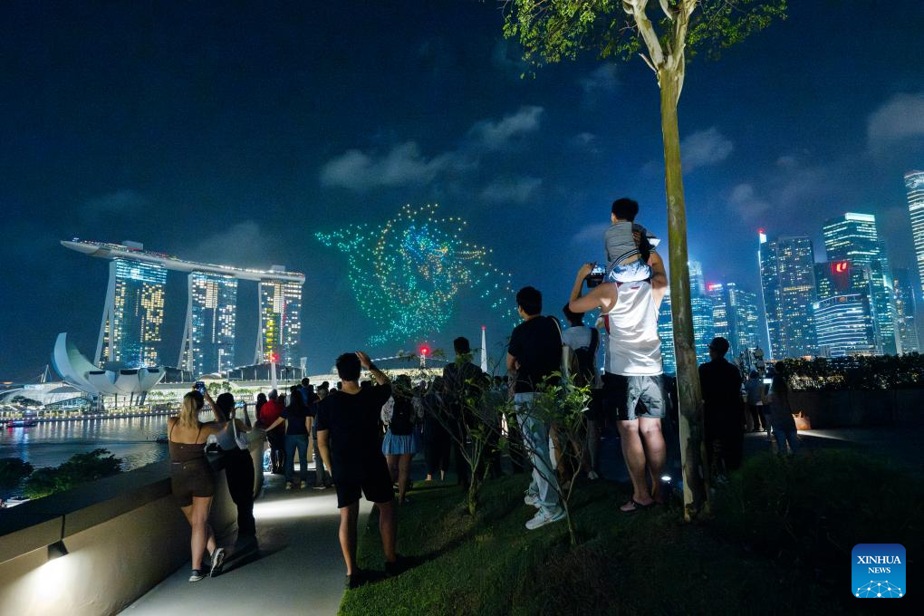 People watch a drone fleet performance celebrating the Year of the Dragon at Singapore's Marina Bay on Feb. 15, 2024. (Photo by Then Chih Wey/Xinhua)