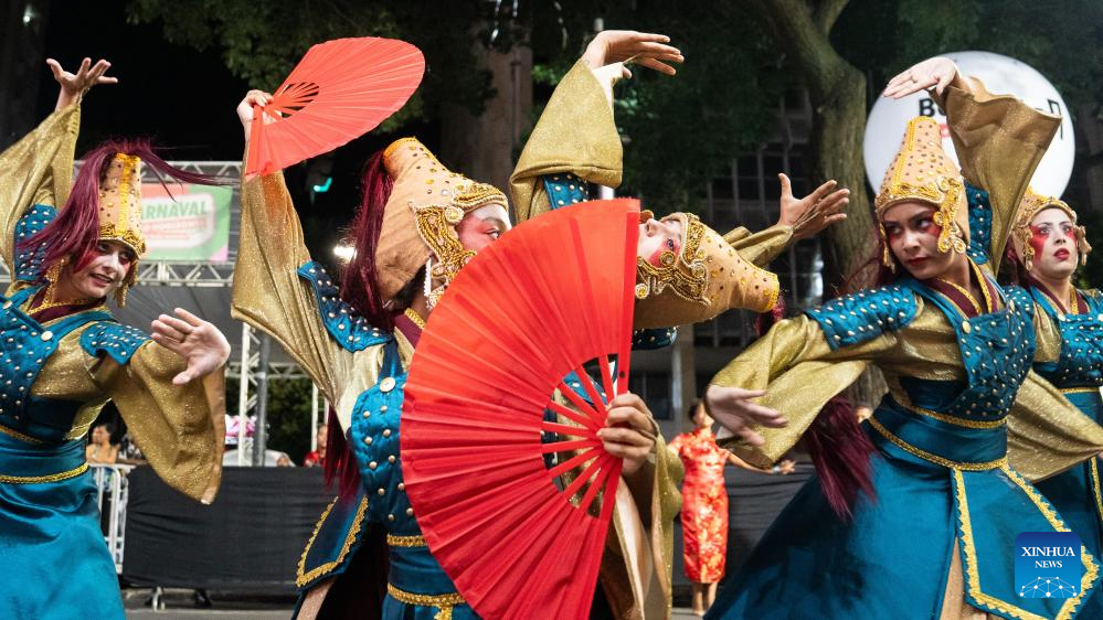 Members of Cidade Jardim Samba School participate in a carnival in Belo Horizonte, Brazil, Feb. 14, 2024. The school members staged performances at the event to celebrate the 50th anniversary of the establishment of diplomatic relations between China and Brazil and the Chinese Lunar New Year. (Xinhua/Wang Tiancong)