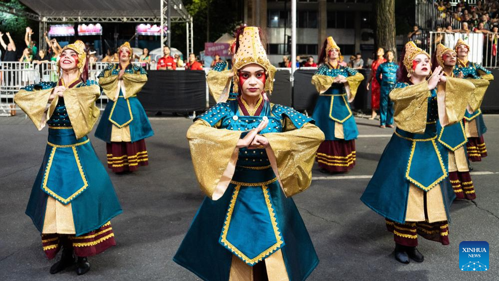Members of Cidade Jardim Samba School participate in a carnival in Belo Horizonte, Brazil, Feb. 14, 2024. The school members staged performances at the event to celebrate the 50th anniversary of the establishment of diplomatic relations between China and Brazil and the Chinese Lunar New Year. (Xinhua/Wang Tiancong)