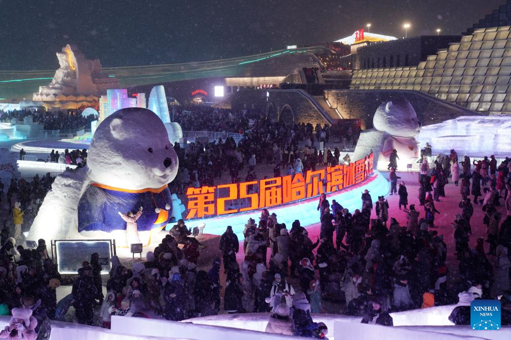 Tourists enjoy their time at the Ice and Snow World in Harbin, northeast China's Heilongjiang Province, Feb. 14, 2024. More Chinese people nowadays choose to go on a journey during the Spring Festival to experience different cultures and lunar new year atmosphere. (Xinhua/Wang Jianwei)