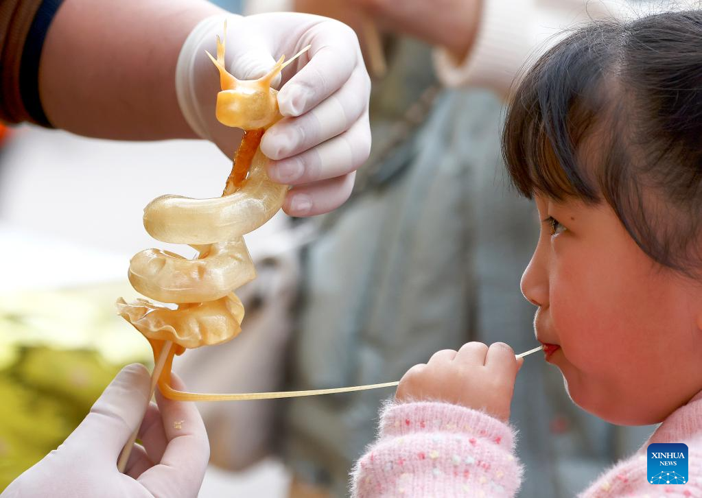 A child tries to blow a sugar figure at a scenic area in Lishui District of Nanjing, east China's Jiangsu Province, Feb. 13, 2024. People across the country immersed themselves in the festive atmosphere of the Chinese New Year by enjoying traditional food and local snacks. (Photo by Xin Yi/Xinhua)