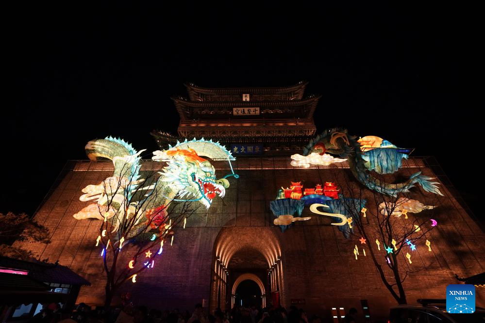 This photo taken on Feb. 16, 2024 shows a lantern show held in Taiyuan Ancient County scenic spot in Taiyuan, north China's Shanxi Province. (Xinhua/Zhan Yan)