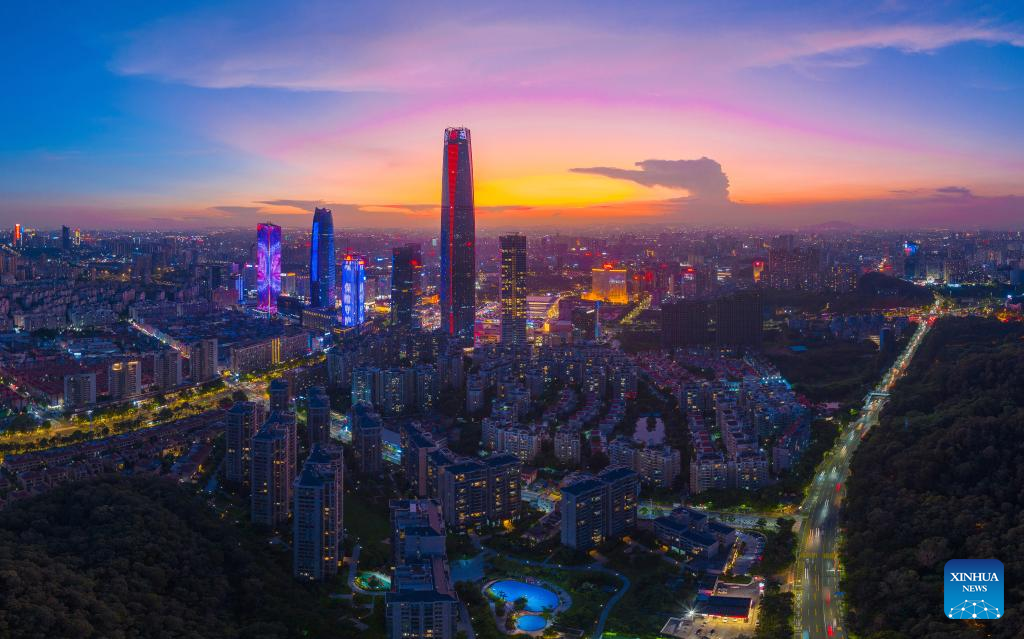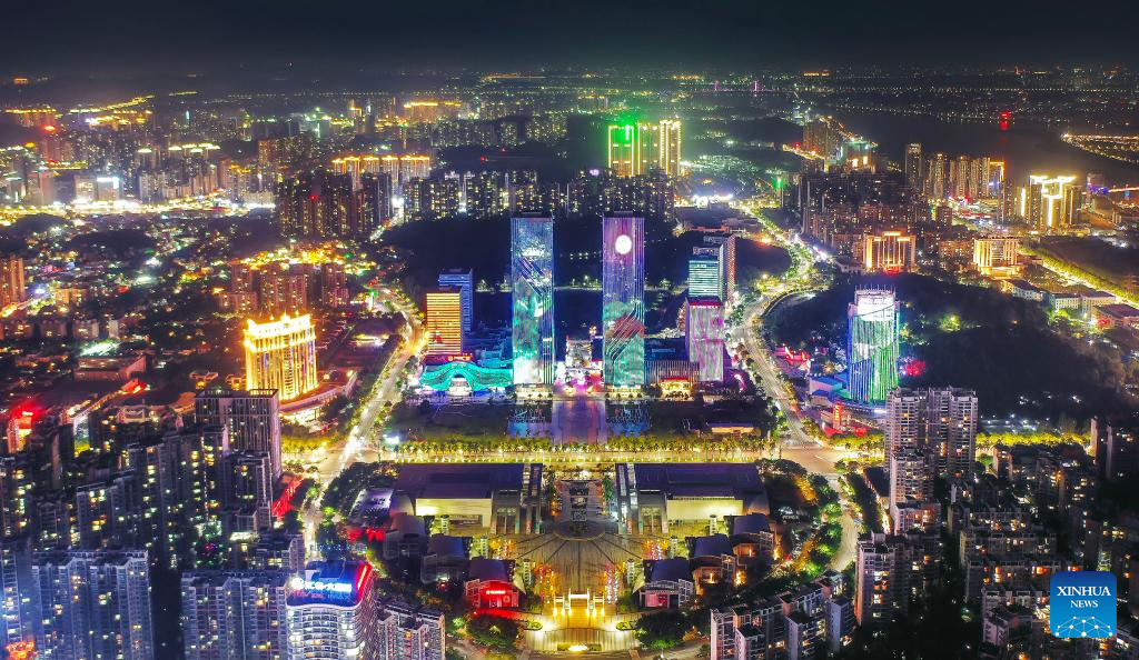 An aerial drone photo taken on Sept. 29, 2023 shows a night view of Jiangmen, south China's Guangdong Province. (Photo by Zhou Huadong/Xinhua)