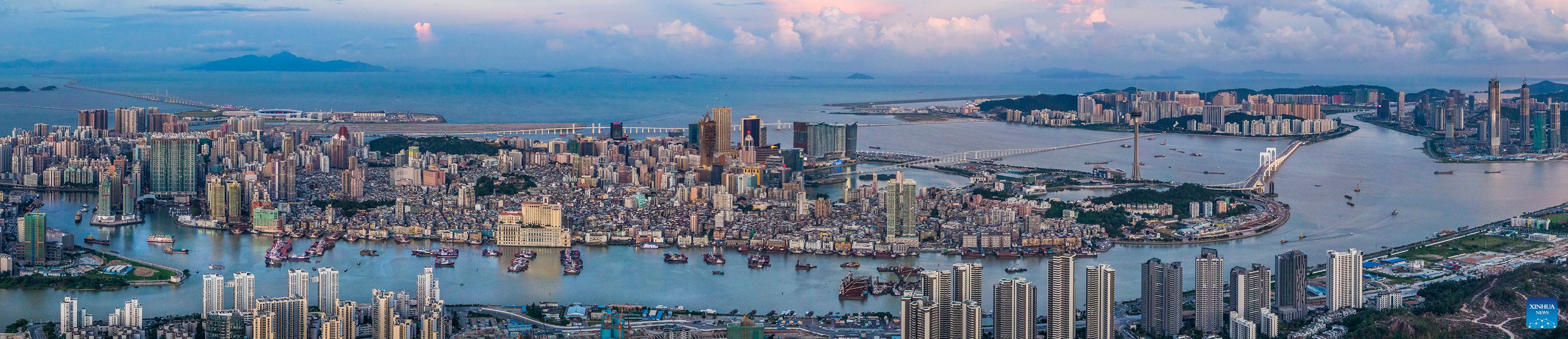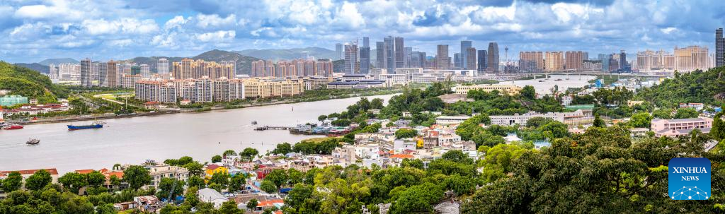 An aerial drone photo taken on July 8, 2022 shows a view of Zhuhai of south China's Guangdong Province and south China's Macao (front). (Photo by Guo Jingwen/Xinhua)