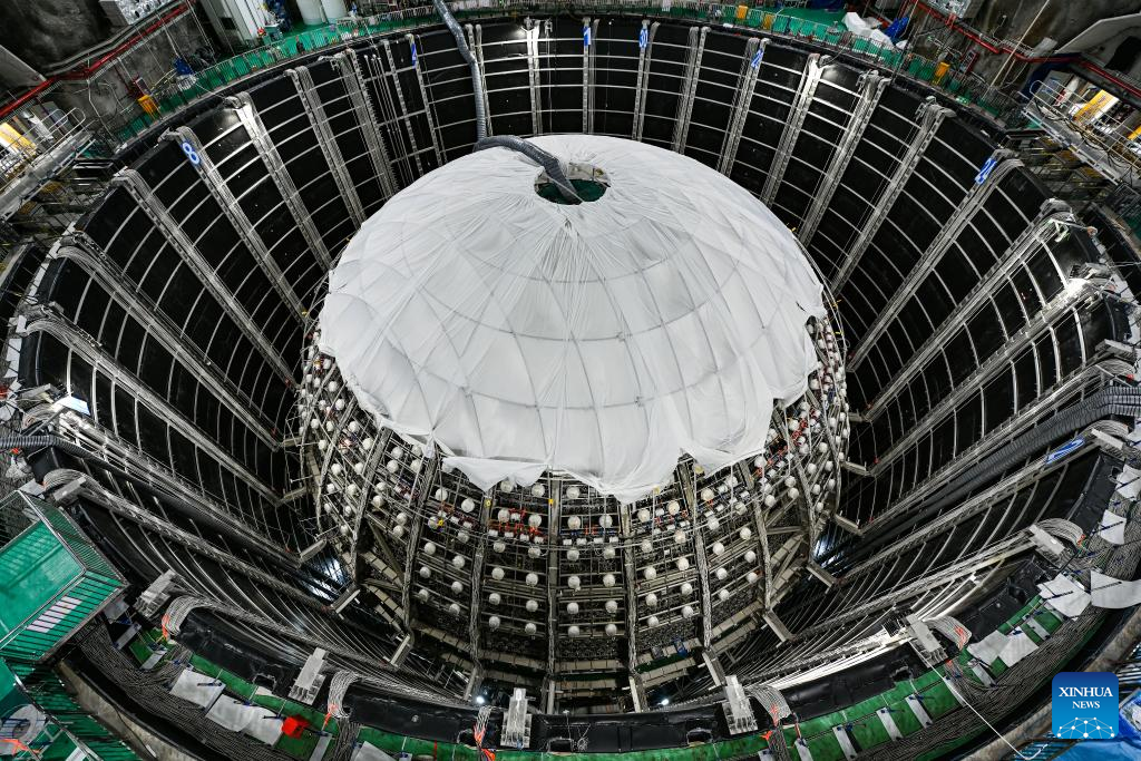 This aerial photo taken on Nov. 12, 2023 shows the construction site of the underground neutrino observatory in Jiangmen, south China's Guangdong Province. (Photo by Liu Yuexiang/Xinhua)
