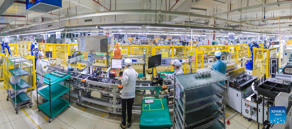 This panoramic photo taken on Jan. 5, 2022 shows a production line of Foryou Corporation in Huizhou, south China's Guangdong Province. (Photo by Wang Jianqiao/Xinhua)
