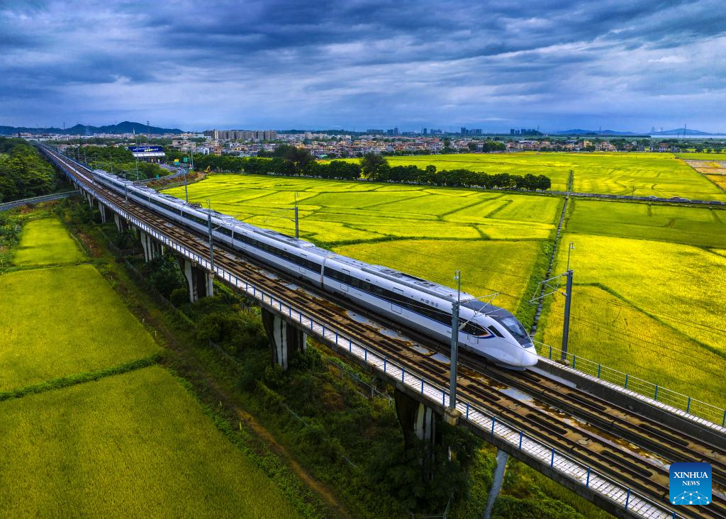 An aerial drone photo taken on June 4, 2023 shows a bullet train running through paddy fields in Zhongshan, south China's Guangdong Province. (Photo by Zhang Jianlai/Xinhua)