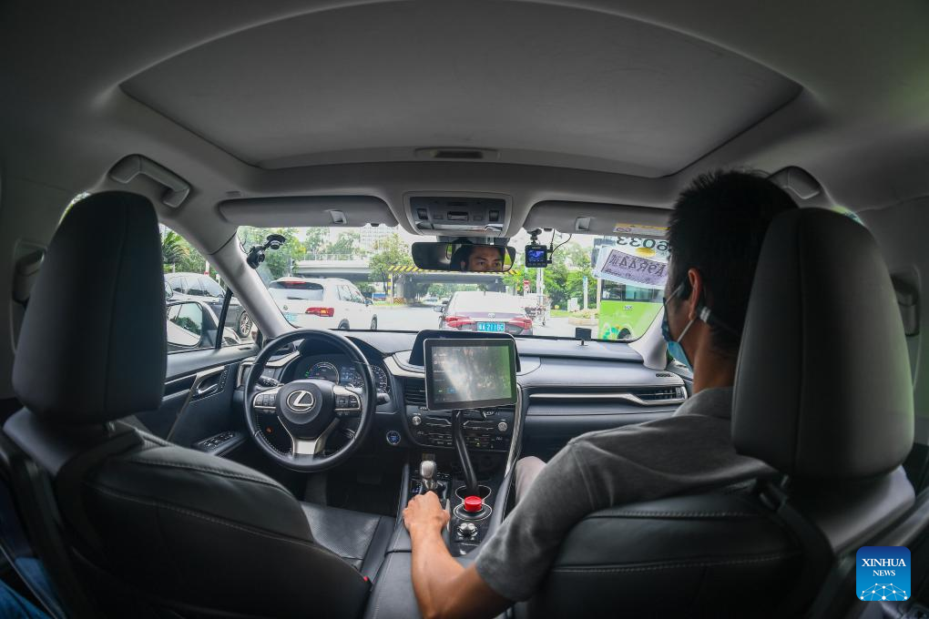 An autonomous driving taxi, operated by Chinese autonomous vehicle company Pony.ai, runs on a road in Nansha District of Guangzhou, south China's Guangdong Province, June 15, 2022. (Xinhua/Liu Dawei)