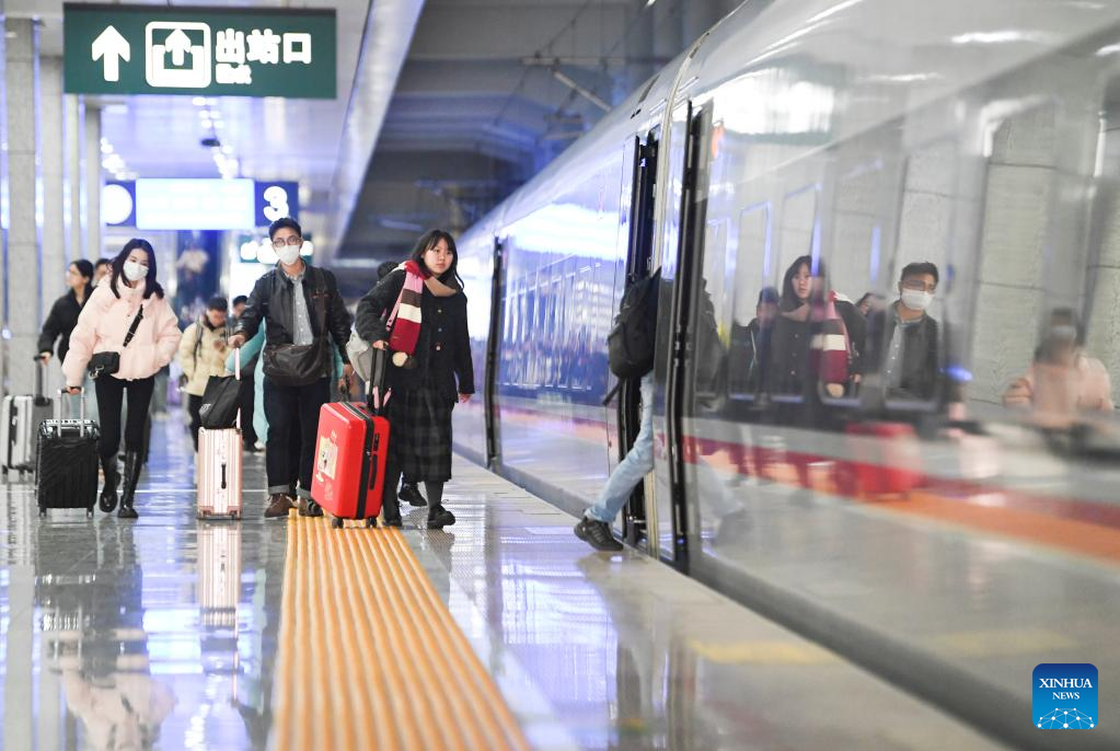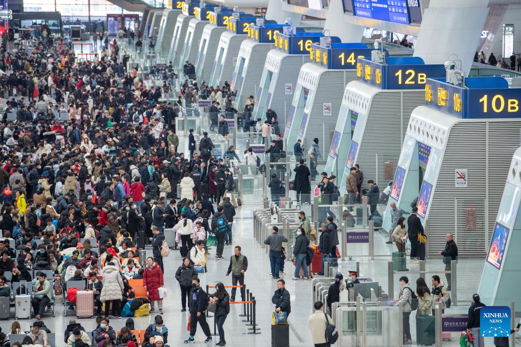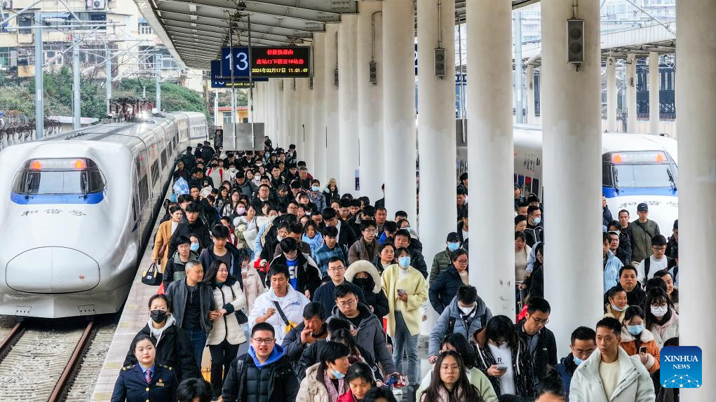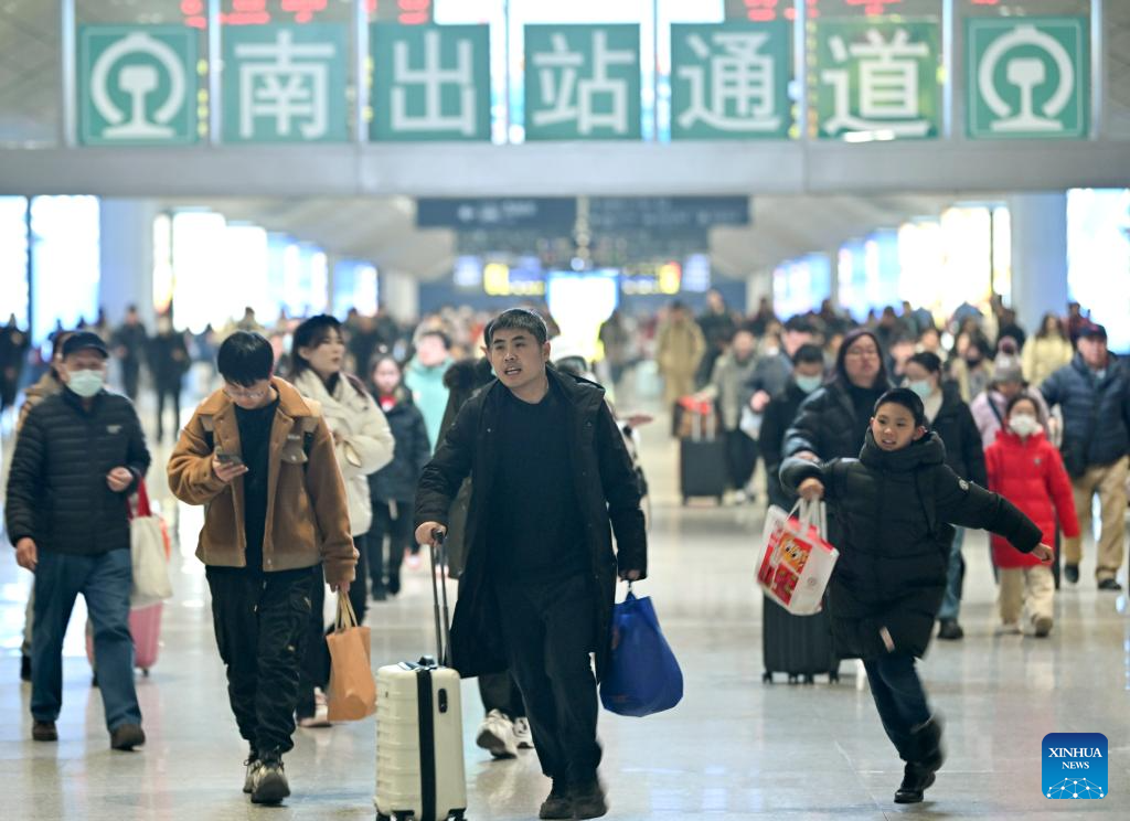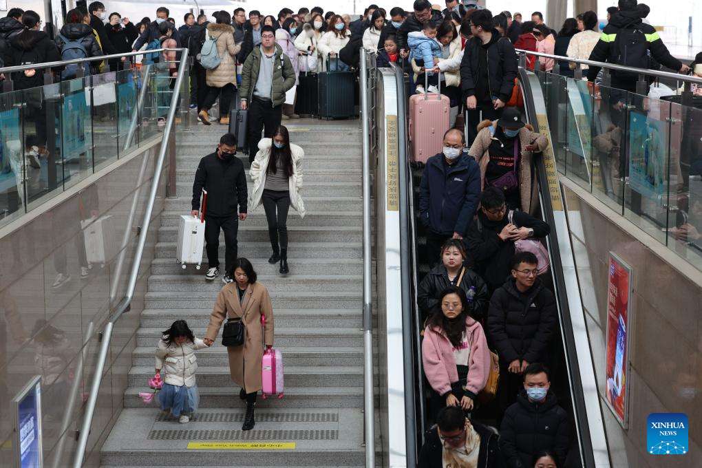 Travelers arrive at Nanjing Railway Station in Nanjing, east China's Jiangsu Province, Feb. 16, 2024. China witnessed an increase of passenger trips as this year's Spring Festival holiday is coming to an end. (Photo by Yang Suping/Xinhua)