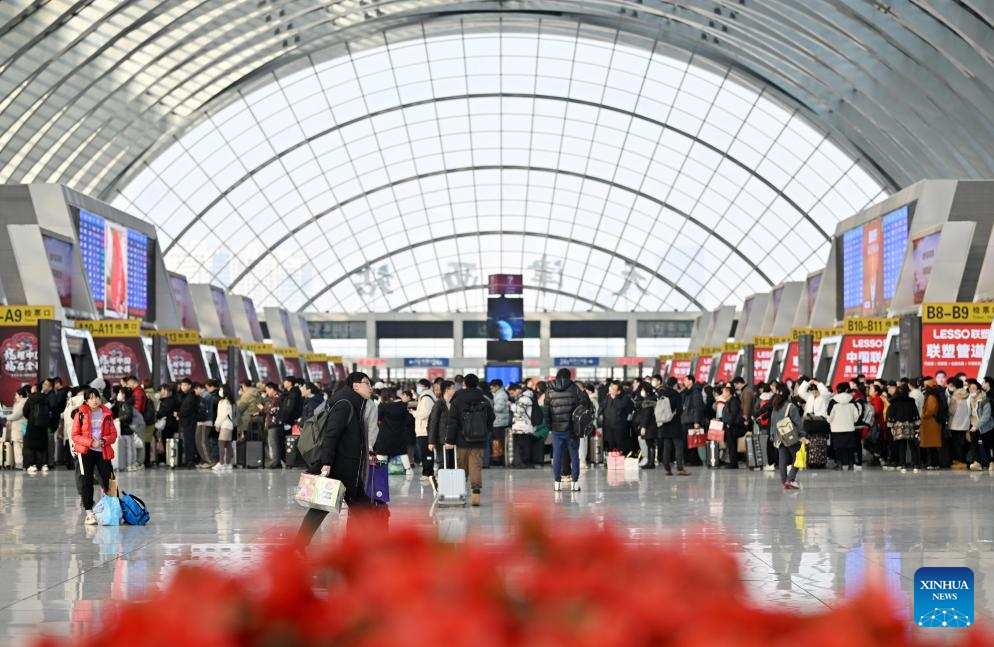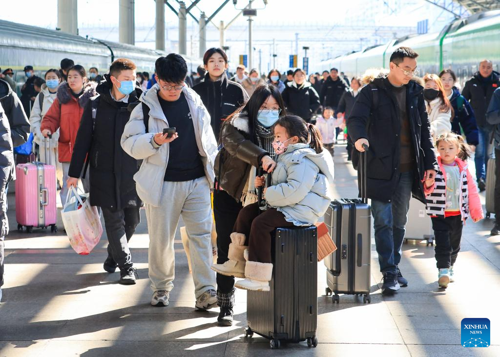 Passengers arrive at Beijing South Railway Station in Beijing, capital of China, Feb. 17, 2024. China witnessed an increase of passenger trips on the last day of the eight-day Spring Festival holiday. (Xinhua/Xing Guangli)