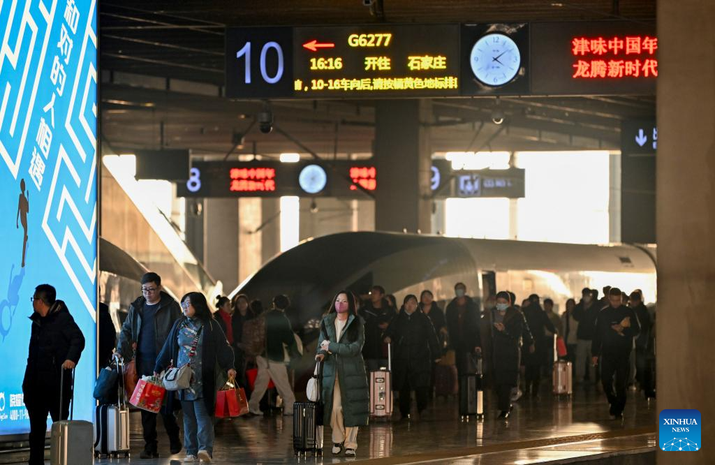 Passengers arrive at Tianjin West Railway Station in north China's Tianjin, Feb. 17, 2024. China witnessed an increase of passenger trips on the last day of the eight-day Spring Festival holiday. (Xinhua/Li Ran)