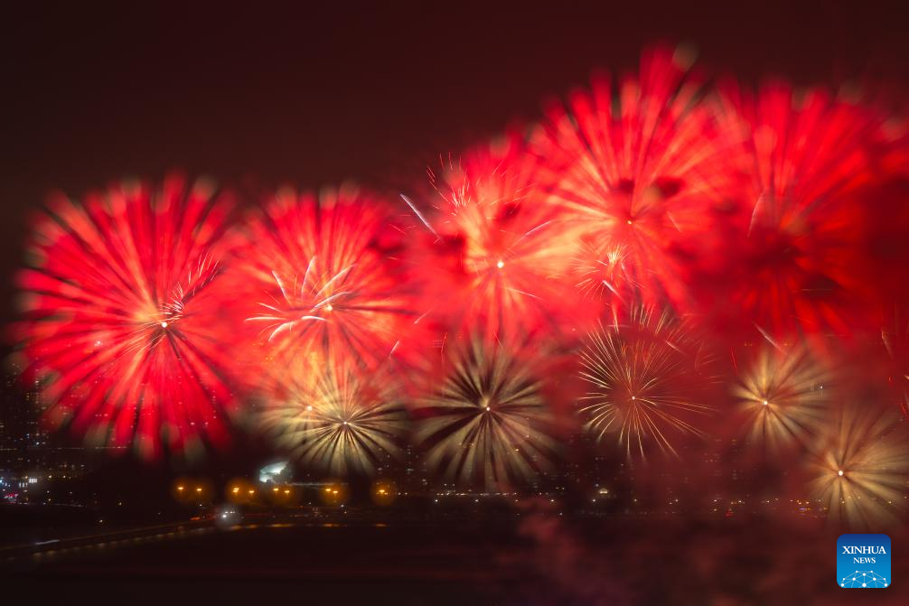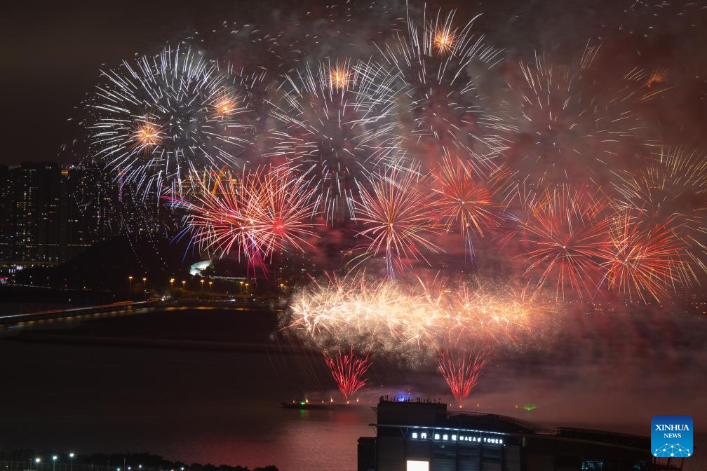 Fireworks in celebration of the Spring Festival illuminate the sky in Macao, south China, Feb. 16, 2024. (Xinhua/Cheong Kam Ka)