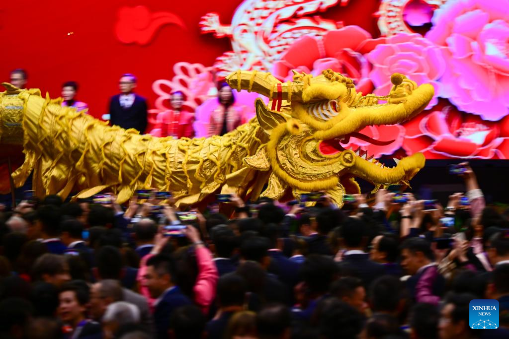 This photo taken on Feb. 16, 2024 shows a dragon dance performance at the Home and Youth Affairs Bureau Spring Reception 2024 in Hong Kong, south China. (Xinhua/Zhu Wei)