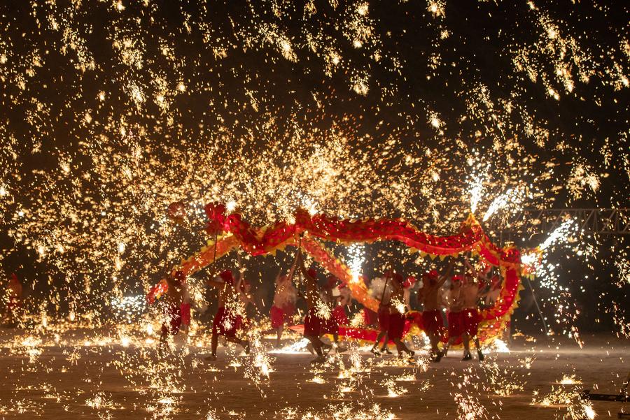 Members of a Tongliang Dragon Dance performing troupe perform "fire dragon dance" in a shower of molten iron in Harbin, northeast China's Heilongjiang Province on Jan. 29, 2024. (Xinhua/Zhang Tao)