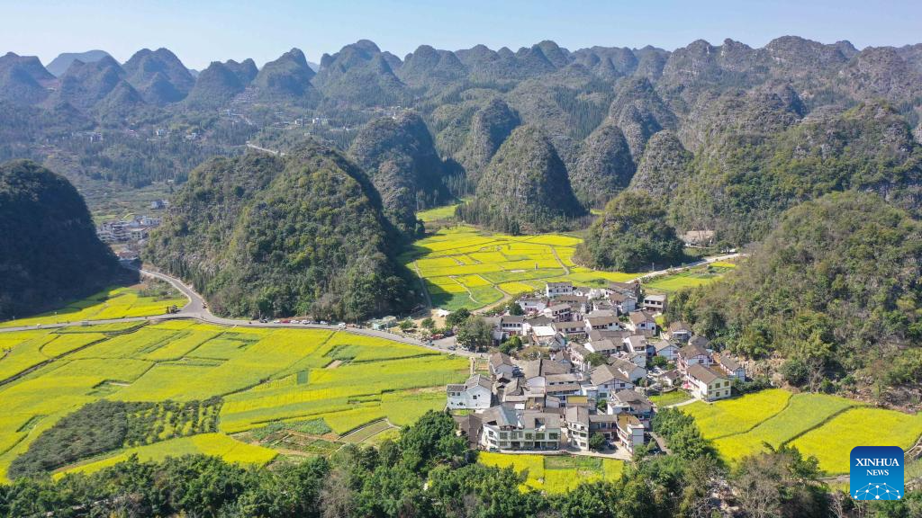 An aerial drone photo shows cole flower fields in Xingyi City, southwest China's Guizhou Province, Feb. 17, 2024. (Photo by Liu Chaofu/Xinhua)