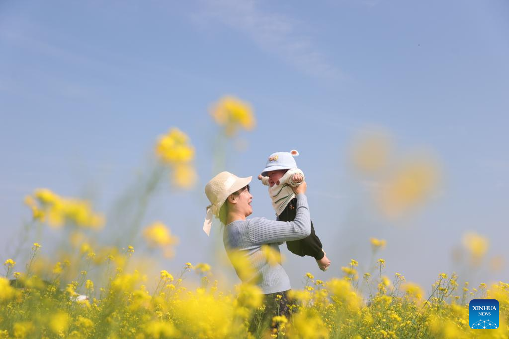 Tourists play in a cole flower field in Daqiao Town of Binyang County, south China's Guangxi Zhuang Autonomous Region, Feb. 16, 2024. (Photo by Liu Zheng/Xinhua)