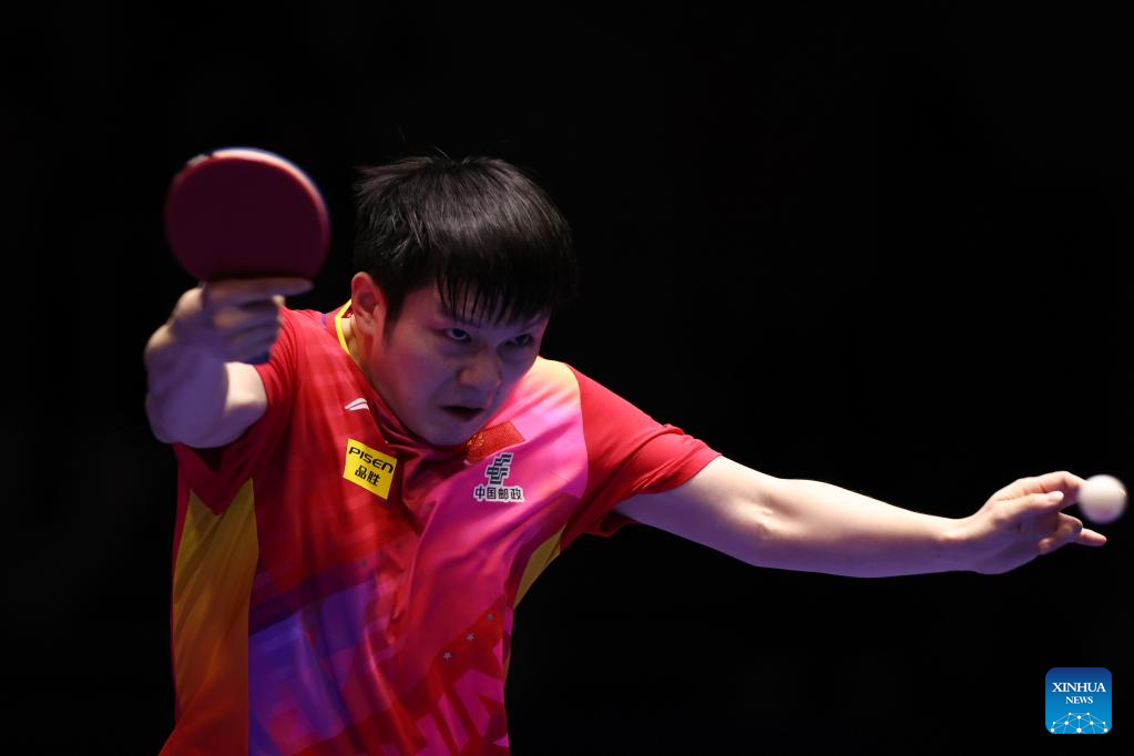 Fan Zhendong of China competes against Bence Majoros of Hungary during the men's team Group 1 match between China and Hungary at the ITTF World Team Table Tennis Championships Finals Busan 2024 in Busan, South Korea, Feb. 18, 2024. (Xinhua/Zhang Tao)