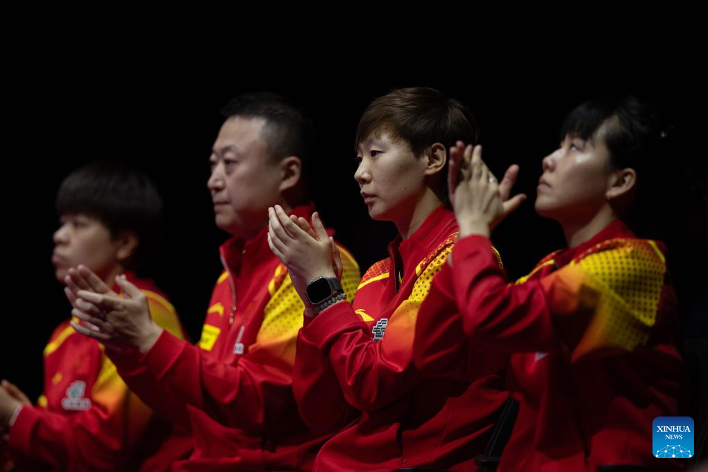 Ma Lin (2nd L), coach of China, and player Wang Manyu (2nd R) applaud during the women's team Group 1 match between China and Spain at the ITTF World Team Table Tennis Championships Finals Busan 2024 in Busan, South Korea, Feb. 18, 2024. (Xinhua/Zhang Tao)