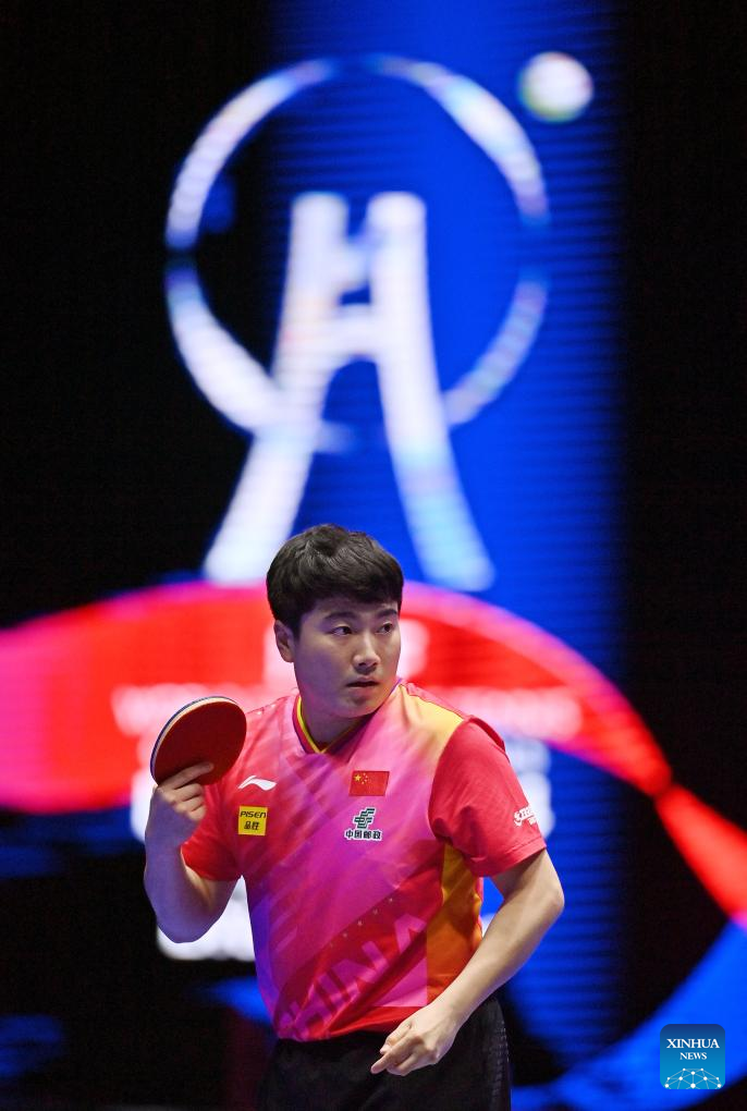 Lin Gaoyuan of China competes against Adam Szudi of Hungary during the men's team Group 1 match between China and Hungary at the ITTF World Team Table Tennis Championships Finals Busan 2024 in Busan, South Korea, Feb. 18, 2024. (Xinhua/Zhang Tao)