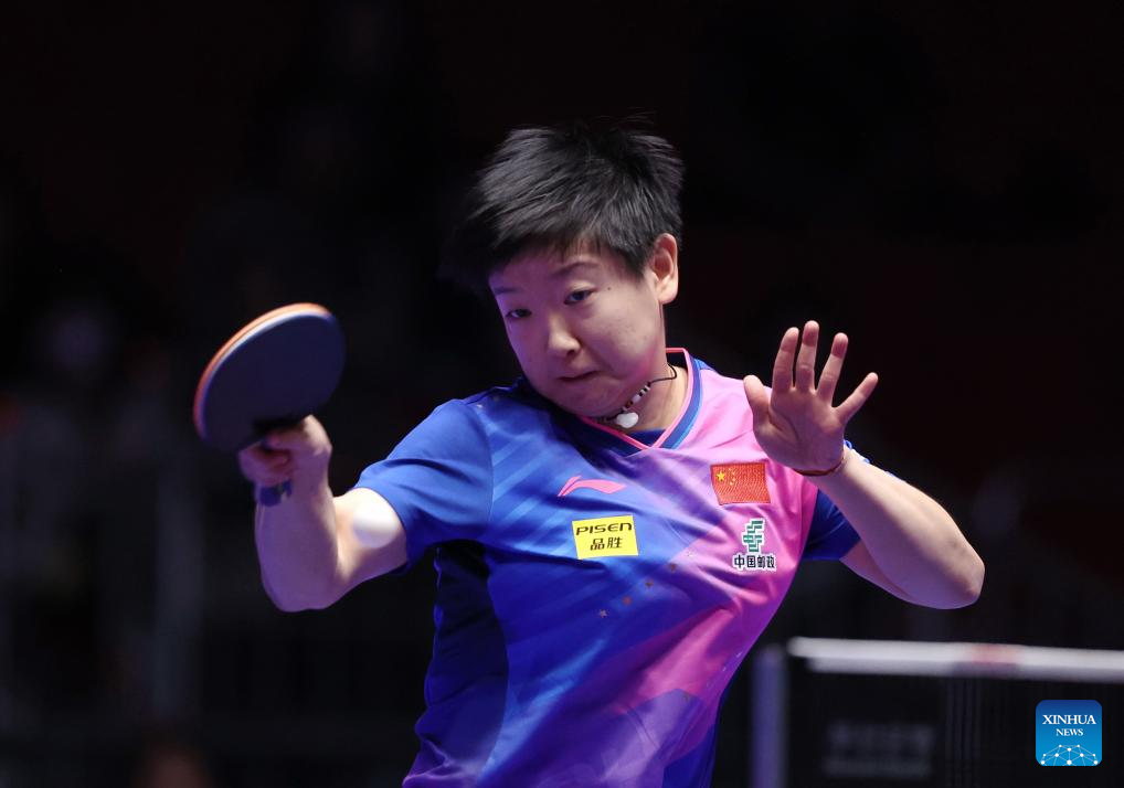 Sun Yingsha of China returns the ball to Maria Xiao of Spain during the women's team Group 1 match between China and Spain at the ITTF World Team Table Tennis Championships Finals Busan 2024 in Busan, South Korea, Feb. 18, 2024. (Xinhua/Yao Qilin)