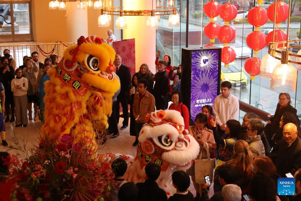 People watch a lion dance at Davies Symphony Hall in San Francisco, California, the United States, Feb. 17, 2024. A concert in celebration of the Chinese Lunar New Year was staged here by San Francisco Symphony on Saturday. (Photo by Liu Yilin/Xinhua)