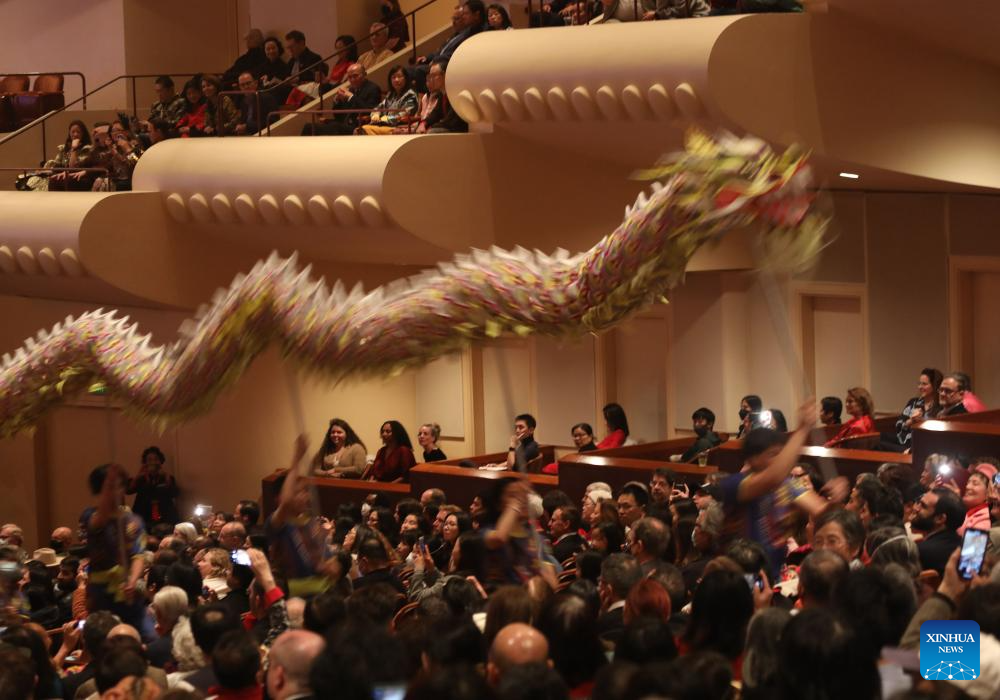 Audiences watch a dragon dance at Davies Symphony Hall in San Francisco, California, the United States, Feb. 17, 2024. A concert in celebration of the Chinese Lunar New Year was staged here by San Francisco Symphony on Saturday. (Photo by Liu Yilin/Xinhua)
