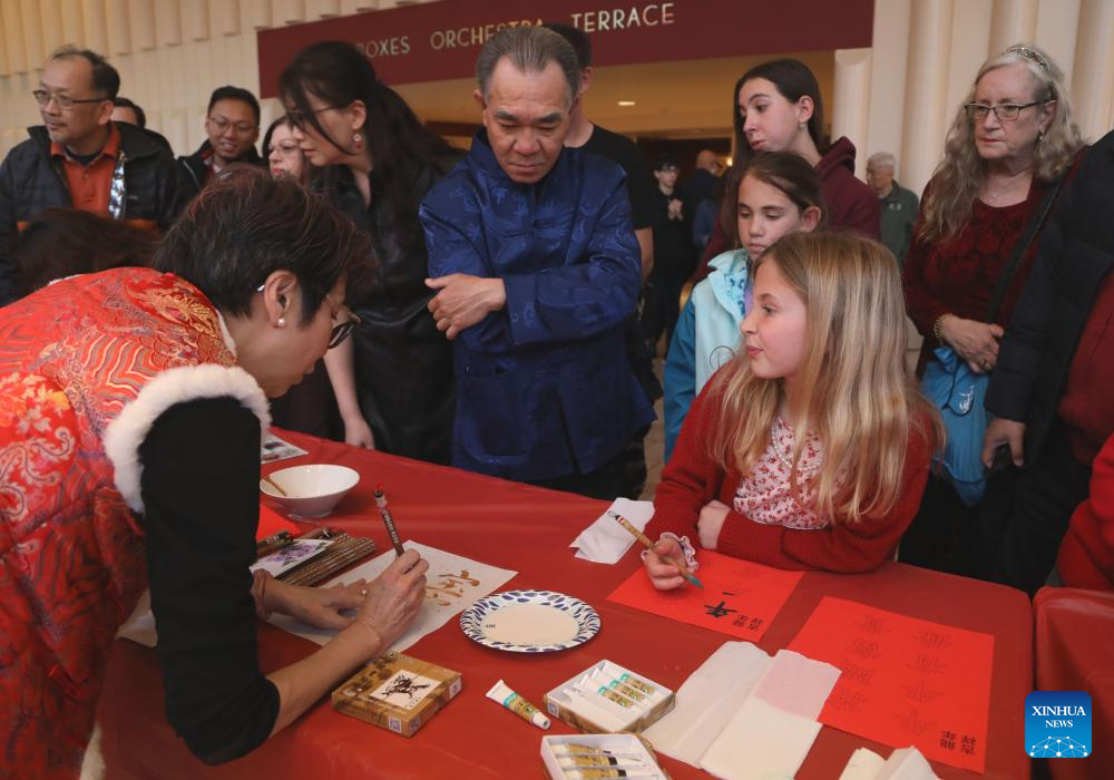 A girl learns Chinese calligraphy from a penman (L, front) at Davies Symphony Hall in San Francisco, California, the United States, Feb. 17, 2024. A concert in celebration of the Chinese Lunar New Year was staged here by San Francisco Symphony on Saturday. (Photo by Liu Yilin/Xinhua)