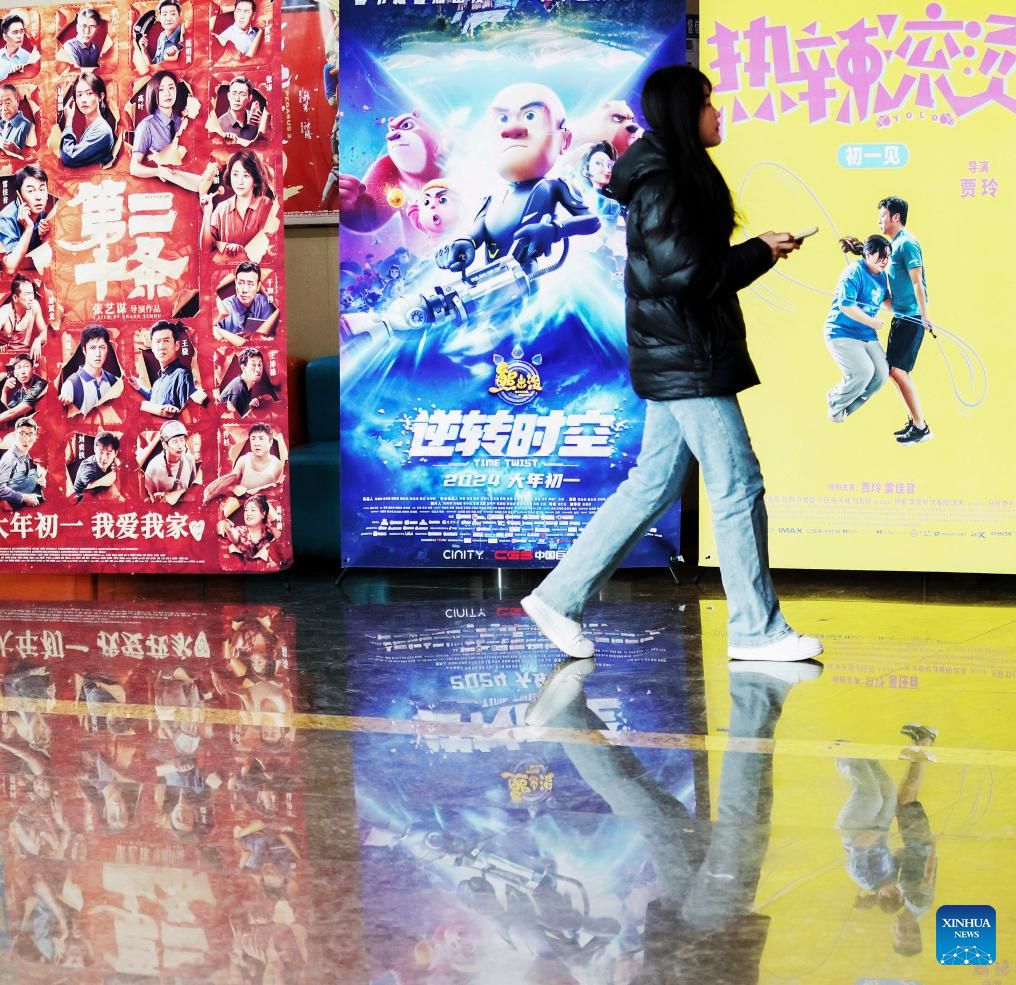A woman walks past film posters at a cinema in Tancheng County of Linyi City, east China's Shandong Province, Feb. 15, 2024. China's box office revenue during the 2024 Spring Festival holiday hit a record high of nearly 8.02 billion yuan (about 1.13 billion U.S. dollars), according to the State Film Administration. (Photo by Zhang Chunlei/Xinhua)