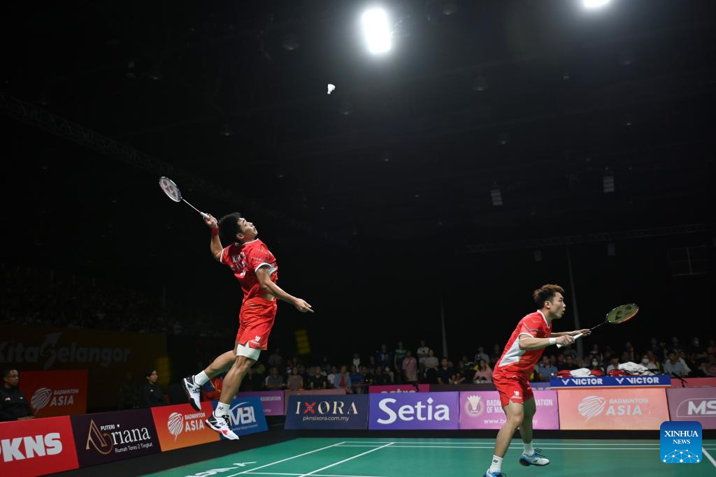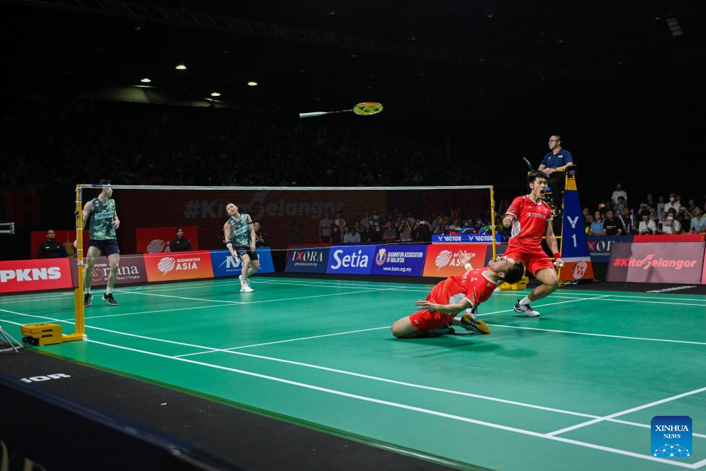 Xie Haonan(R)/Zeng Weihan of China compete against Aaron Chia Teng Fong/Soh Wooi Yik of Malaysia during the men's team final between China and Malaysia at the Badminton Asia Team Championships 2024 in Shah Alam, Selangor, Malaysia, Feb. 18, 2024. (Photo by Chong Voon Chung/Xinhua)