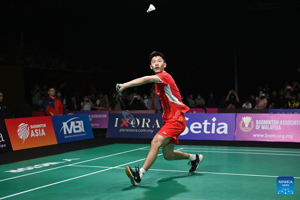 Lei Lanxi of China competes against Eogene Ewe of Malaysia during the men's team final between China and Malaysia at the Badminton Asia Team Championships 2024 in Shah Alam, Selangor, Malaysia, Feb. 18, 2024. (Photo by Chong Voon Chung/Xinhua)