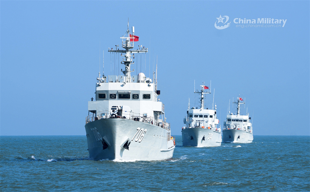 Sea mine countermeasure vessels attached to a PLA Navy group sail in formation during a minesweeping training exercise in late January, 2024. (eng.chinamil.com.cn/Photo by Wang Hu)