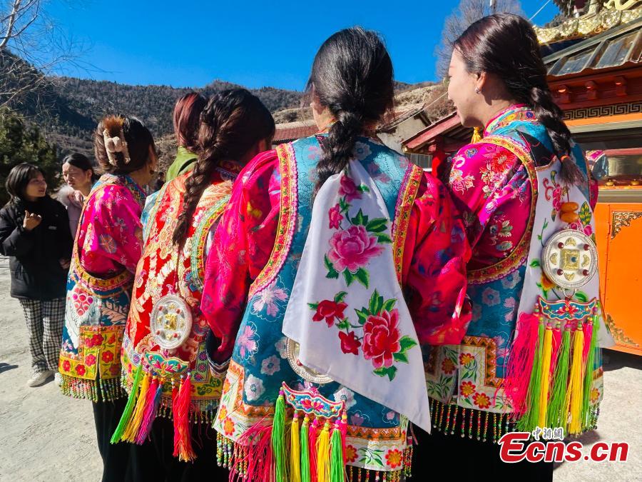 Women dressed in traditional costumes perform Guozhuang dance to celebrate the Tibetan New Year in Gannan Tibetan Autonomous Prefecture, northwest China's Gansu Province. (Photo/China News Service)