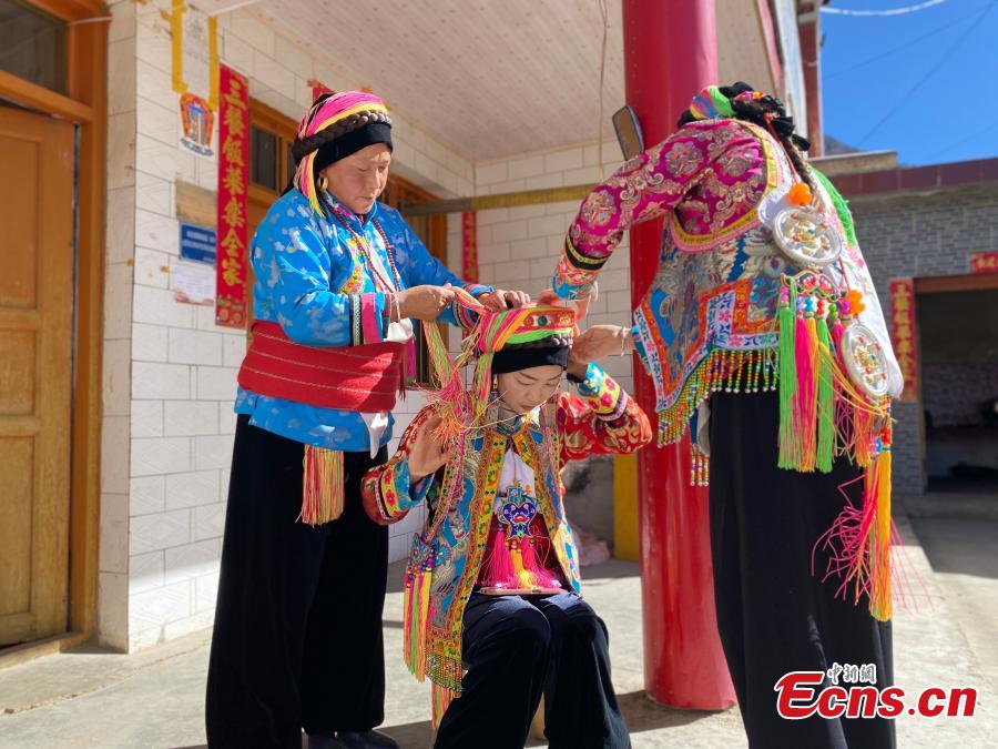 A local young woman dresses up to perform folk dance to celebrate the Tibetan New Year in Gannan Tibetan Autonomous Prefecture, northwest China's Gansu Province. (Photo/China News Service)