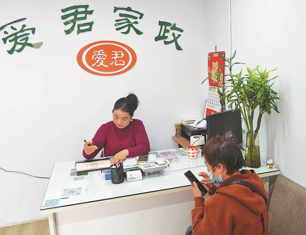 A housekeeping company employee consults with a housekeeper about working during the Spring Festival holiday on Jan 16. CHINA DAILY