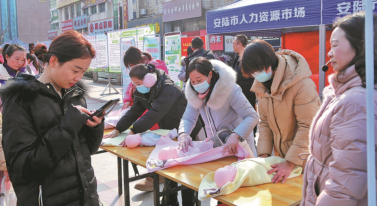 Job seekers showcase parenting skills at a job fair in Hubei province. CHINA DAILY