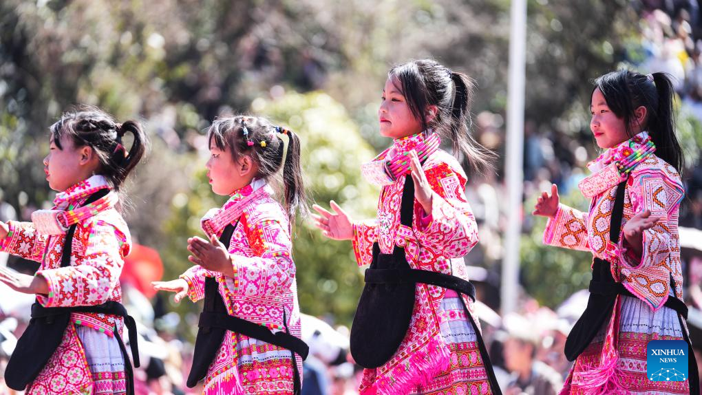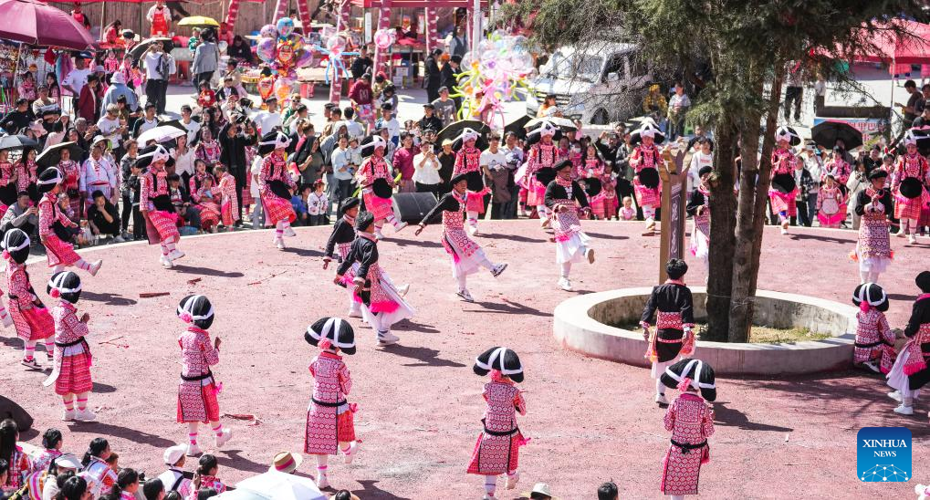 Children perform a dance to celebrate "Tiaohua" festival in Gaoxing Village of Liuzhi Special District, Liupanshui, southwest China's Guizhou Province, Feb. 19, 2024. People of Miao ethnic group celebrated the "Tiaohua" festival here on Monday to pray for the harvest and well-being in the new year. (Xinhua/Tao Liang)