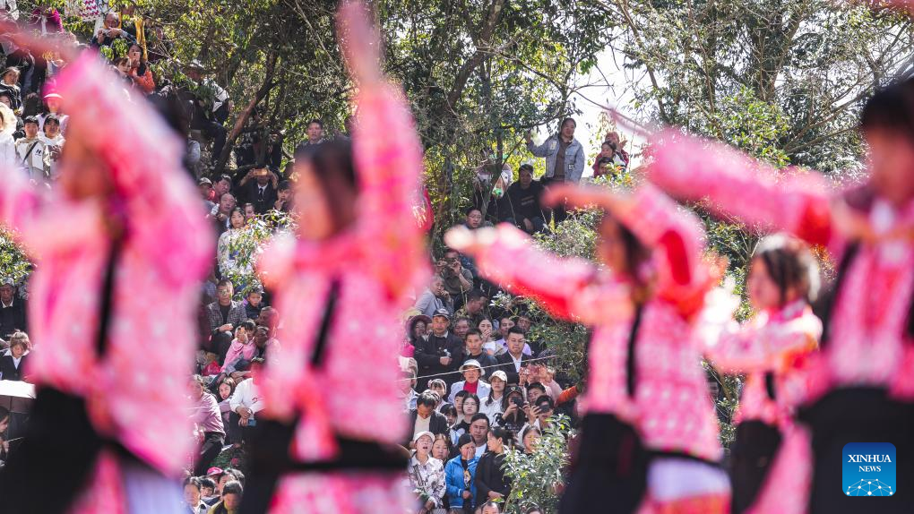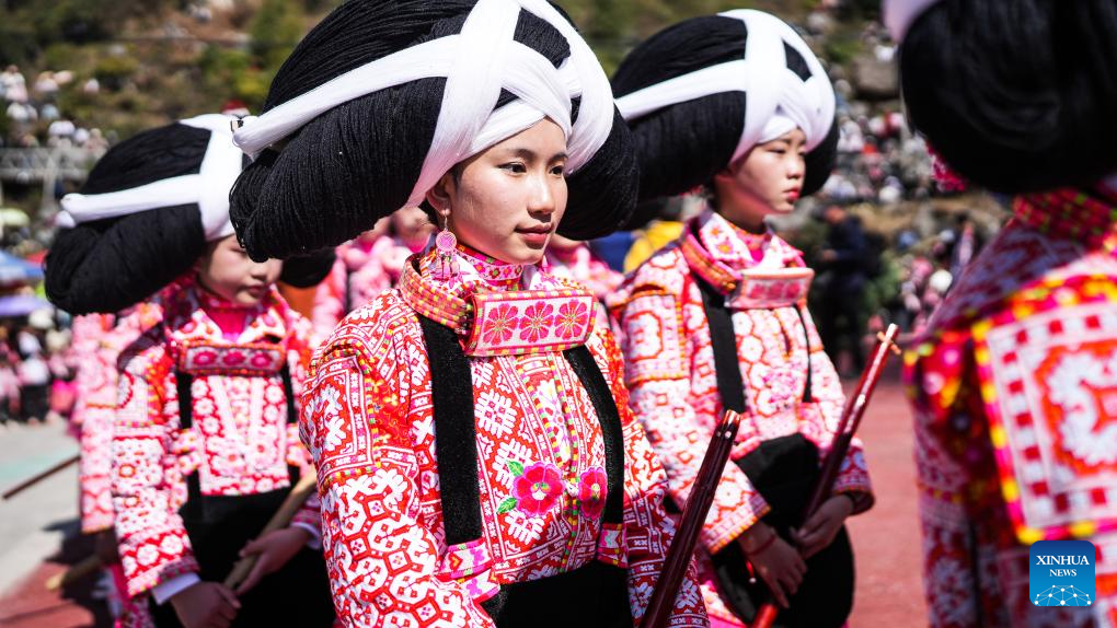 People of Miao ethnic group perform a dance to celebrate "Tiaohua" festival in Gaoxing Village of Liuzhi Special District, Liupanshui, southwest China's Guizhou Province, Feb. 19, 2024. People of Miao ethnic group celebrated the "Tiaohua" festival here on Monday to pray for the harvest and well-being in the new year. (Xinhua/Tao Liang)
