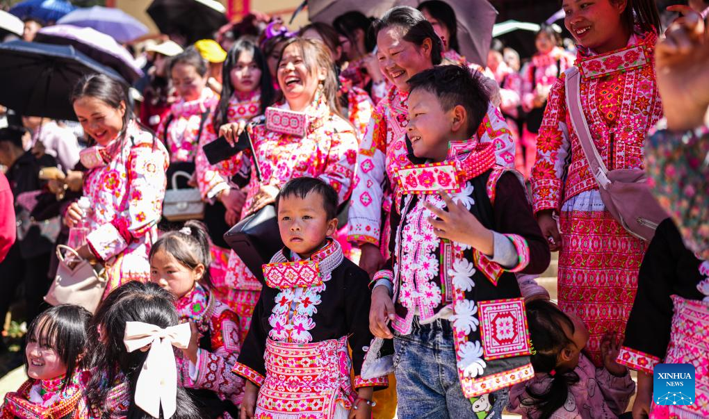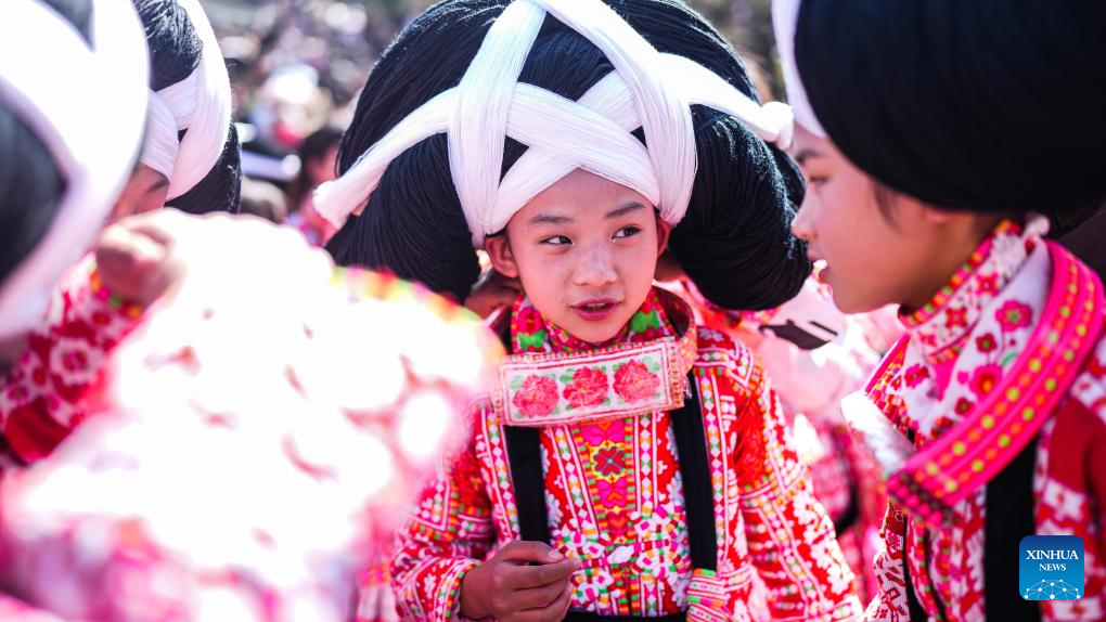 People of Miao ethnic group communicate during a celebration of "Tiaohua" festival in Gaoxing Village of Liuzhi Special District, Liupanshui, southwest China's Guizhou Province, Feb. 19, 2024. People of Miao ethnic group celebrated the "Tiaohua" festival here on Monday to pray for the harvest and well-being in the new year. (Xinhua/Tao Liang)