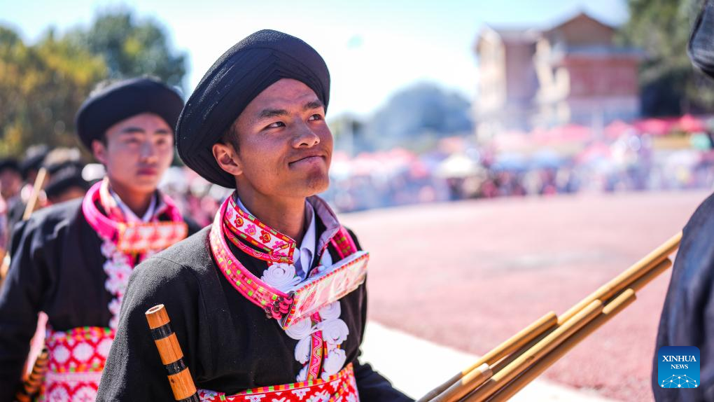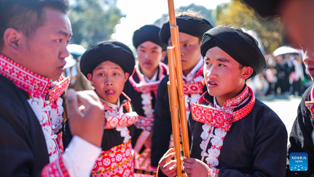 People of Miao ethnic group play lusheng, a reed-pipe wind instrument, to celebrate "Tiaohua" festival in Gaoxing Village of Liuzhi Special District, Liupanshui, southwest China's Guizhou Province, Feb. 19, 2024. People of Miao ethnic group celebrated the "Tiaohua" festival here on Monday to pray for the harvest and well-being in the new year. (Xinhua/Tao Liang)